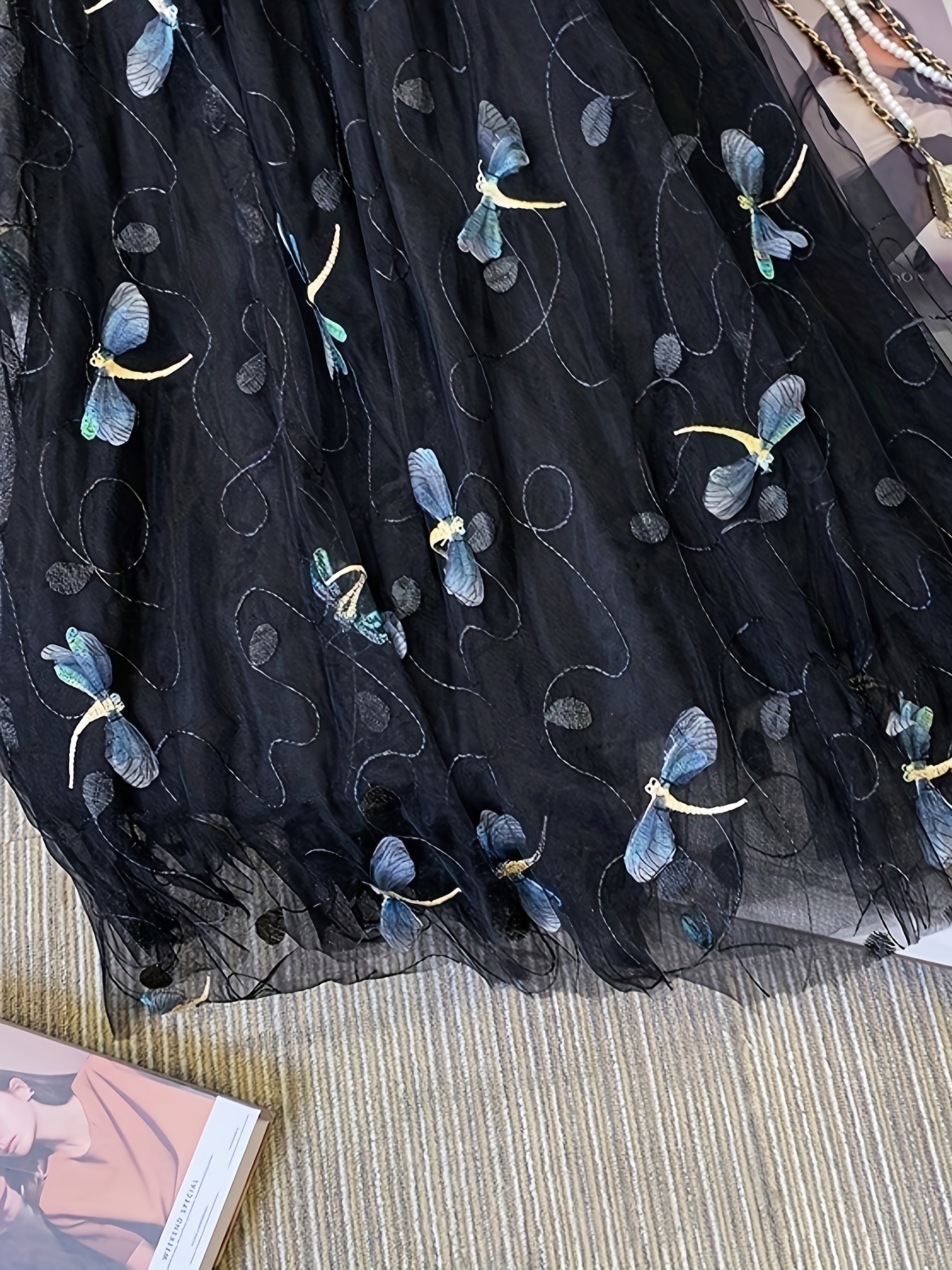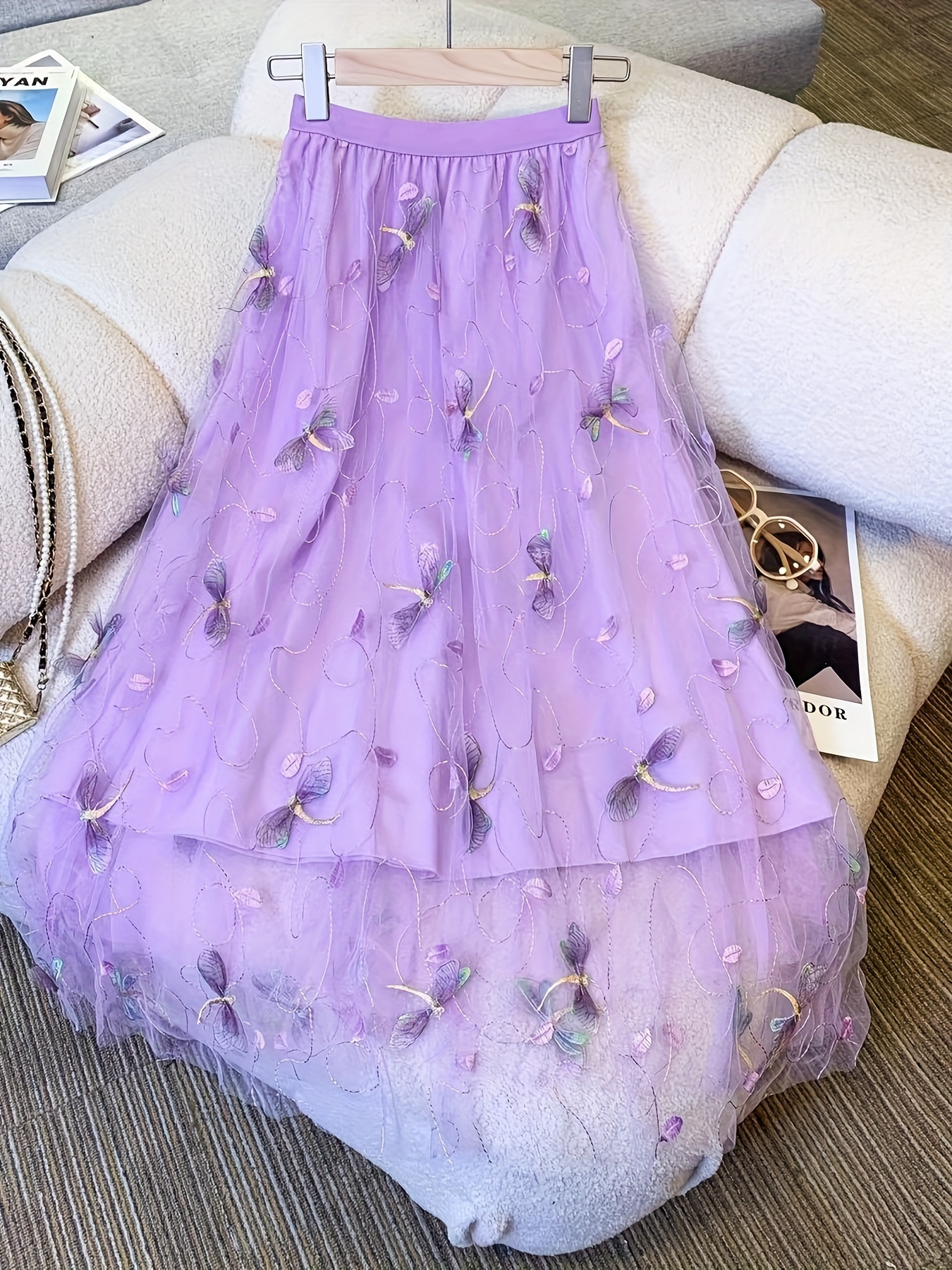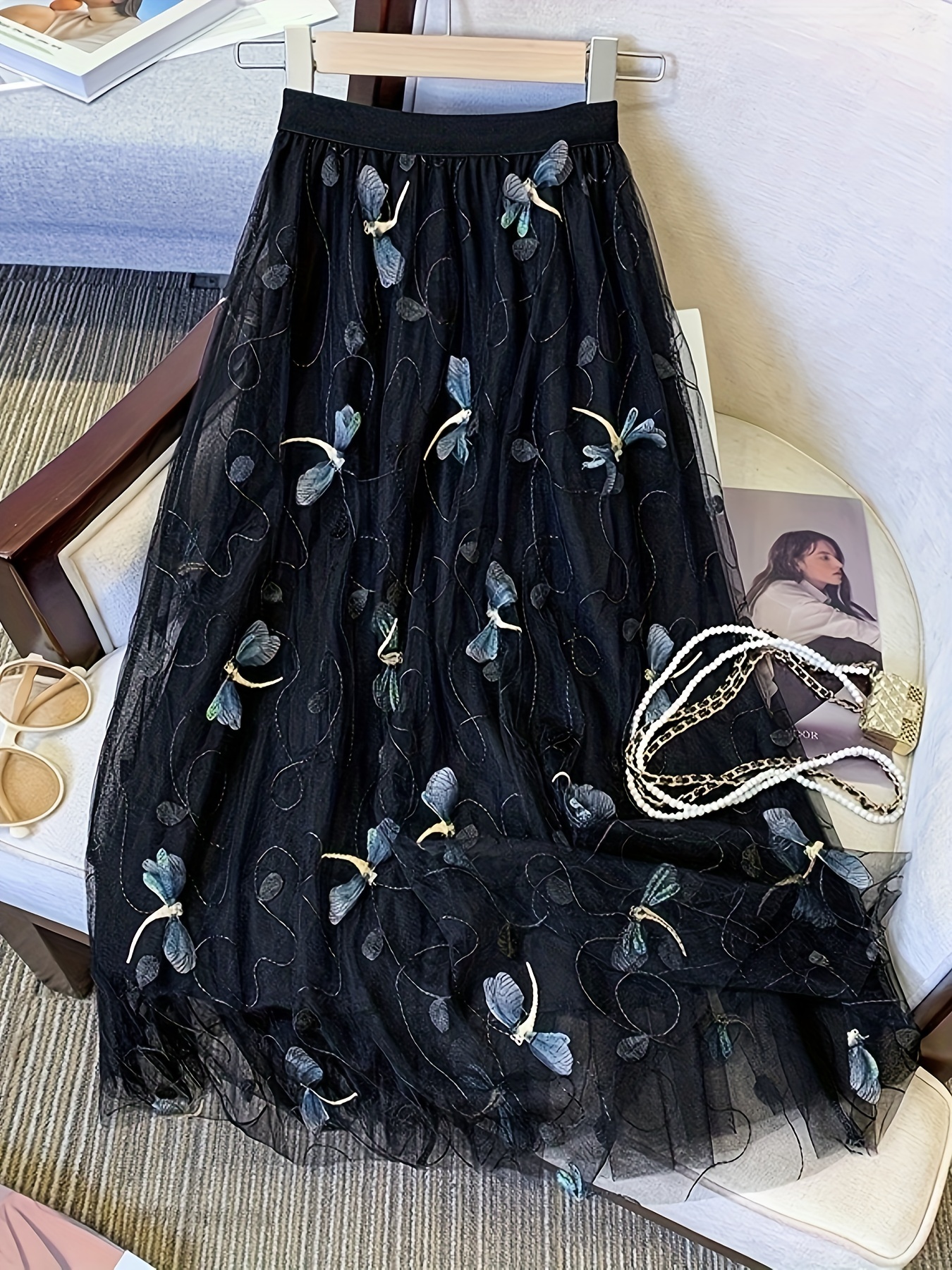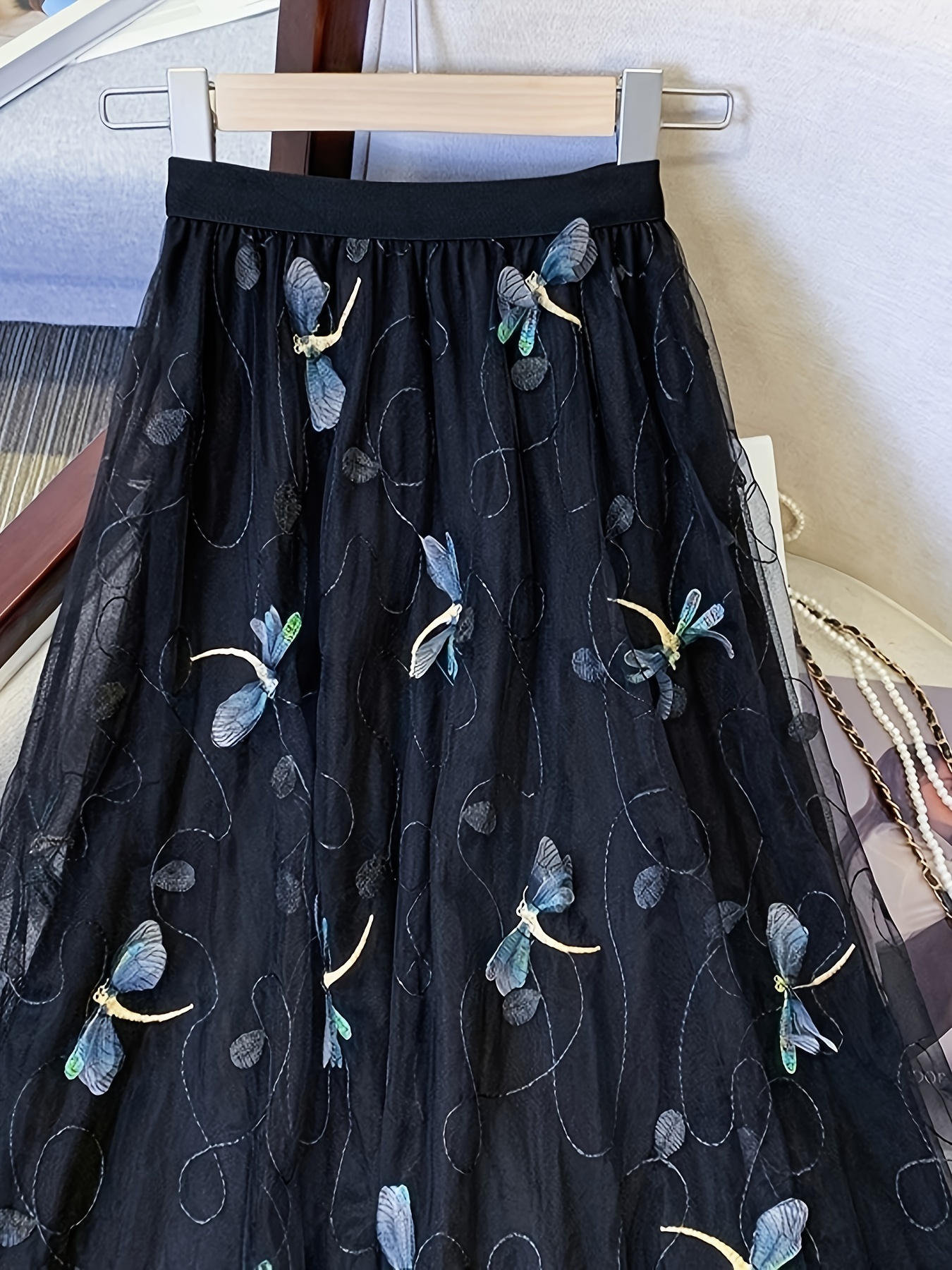 • Dragonfly Applique Tulle Skirt, Casual Elastic Waist Skirt, Women's Clothing
