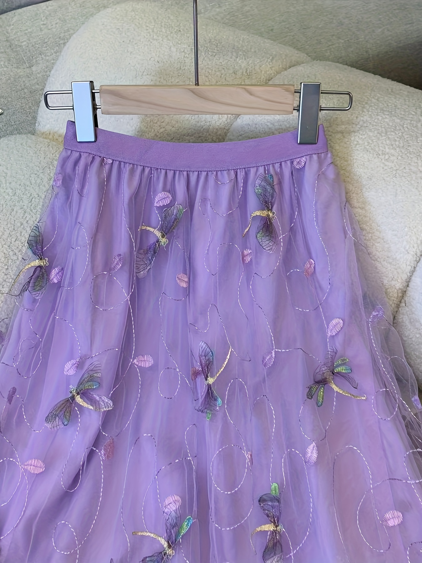 Dragonfly Applique Tulle Skirt, Casual Elastic Waist Skirt, Women's Clothing