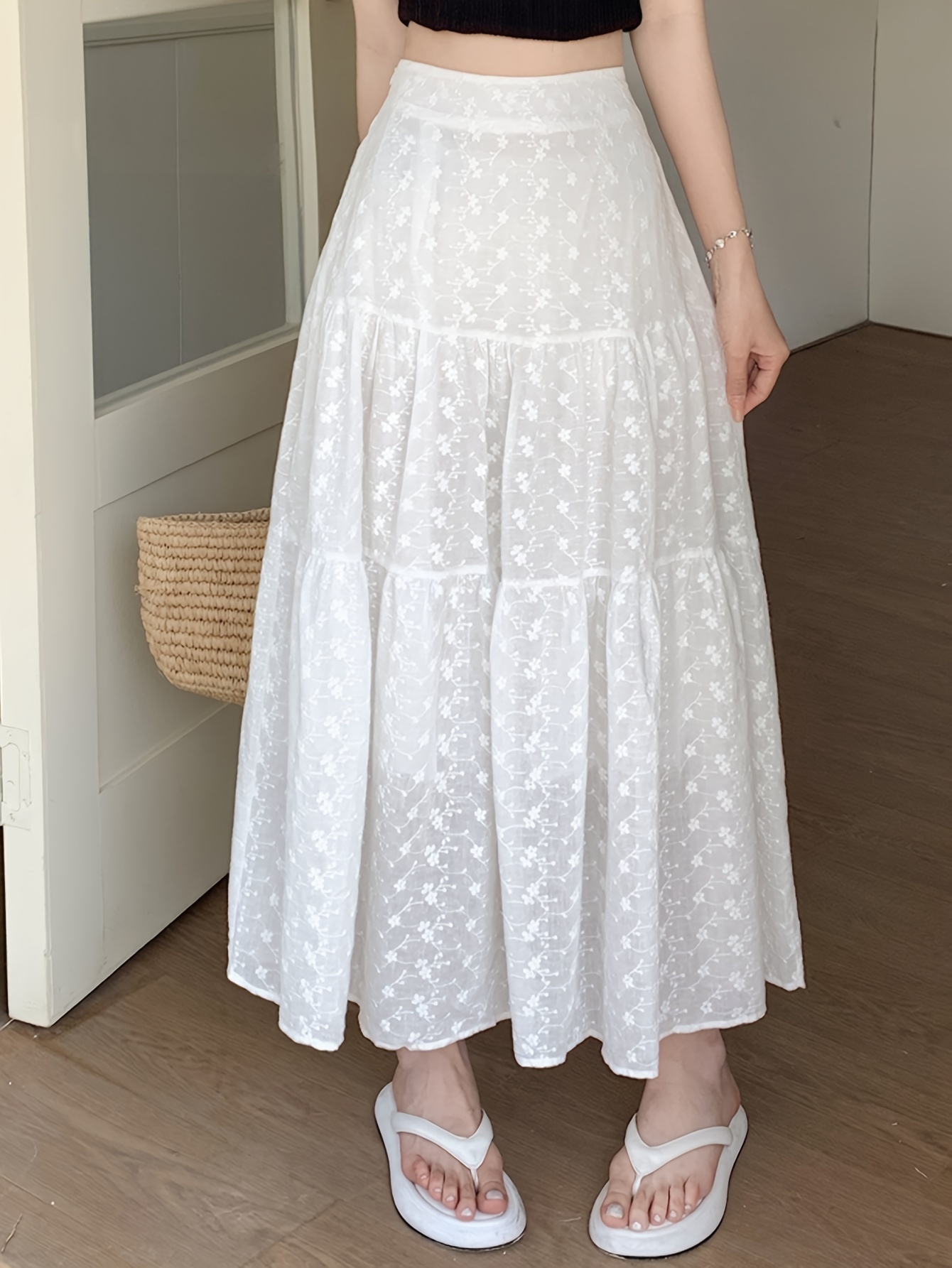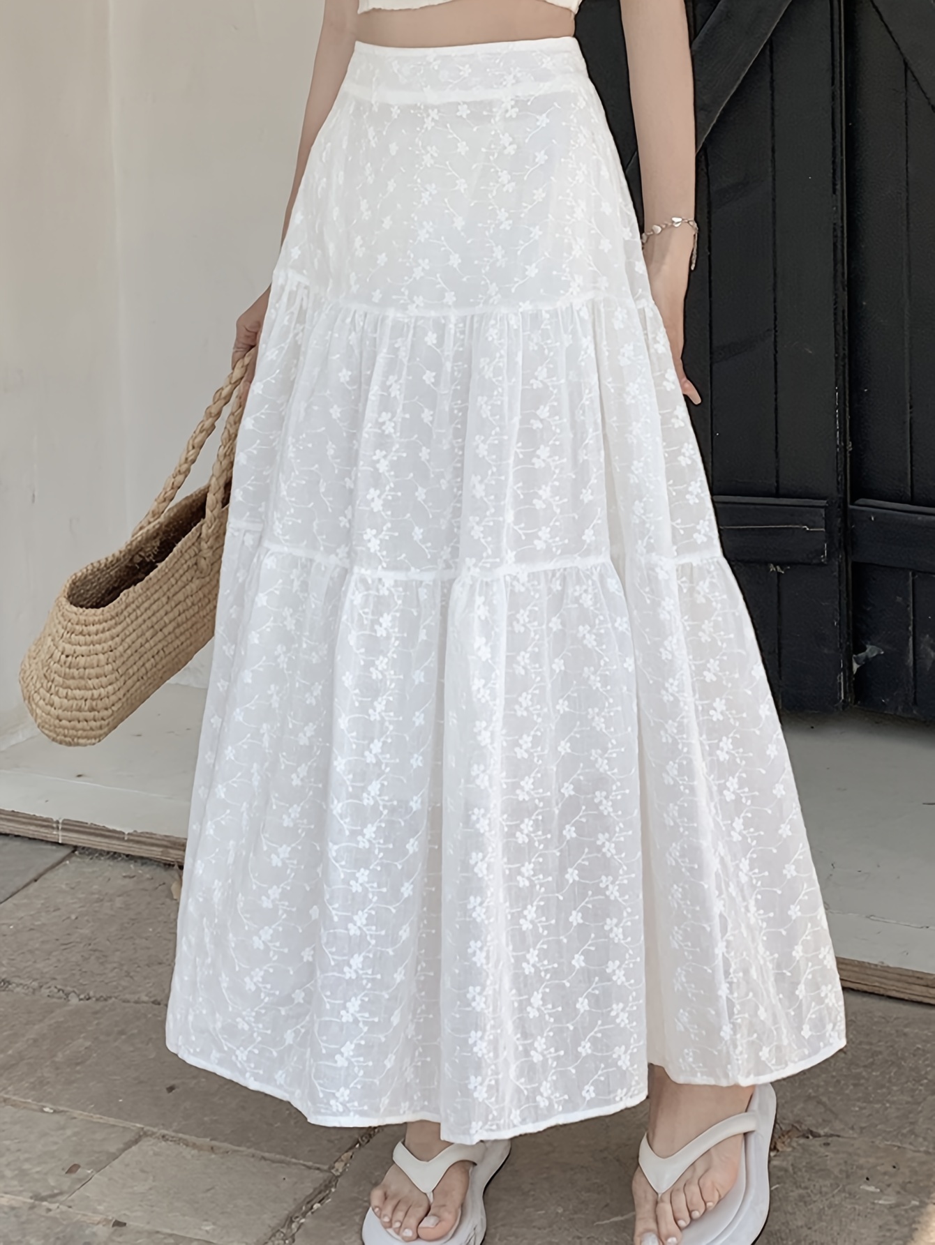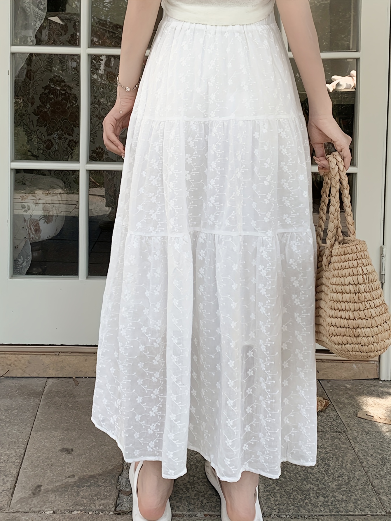 • Floral Pattern High Waist Flared Skirt, Casual Tiered Mesh Maxi Skirt, Women's Clothing